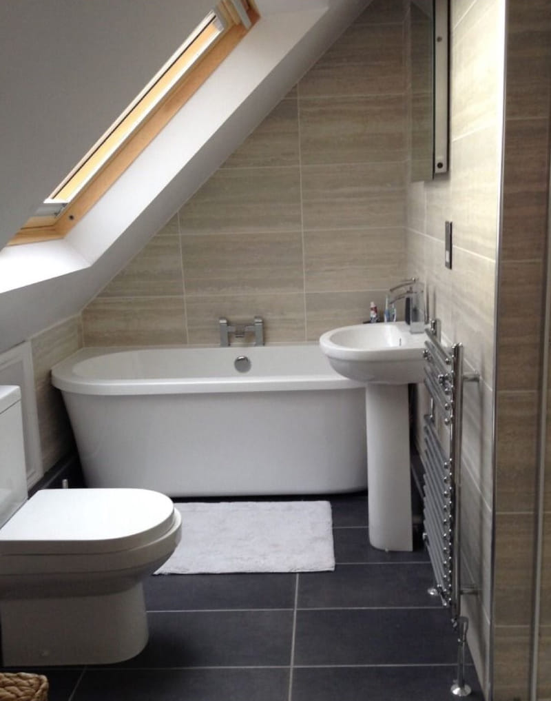 The bathroom has a showering area and the bathroom tub. A contemporary attic bathroom with large windows, an oval bathtub, a vanity with a round mirror, a wooden stool (velux) a modern attic bathroom with a wooden vanity, a clawfoot bathtub, a sink and a blinded window (colin cadle photography) Converting a loft space and adding a bathroom is really common and a great way to add more space and value to your home. You can even get a bathtub which you can bring with you. Either you can keep the decor minimal, bright modernism, rustic or cosy vintage as well.
